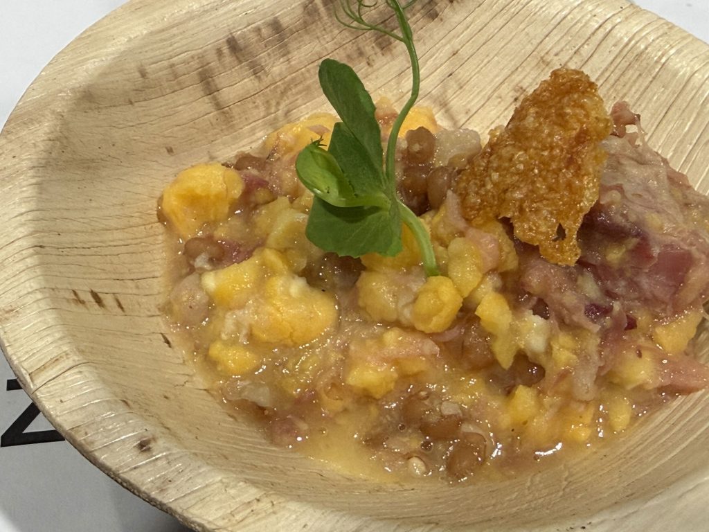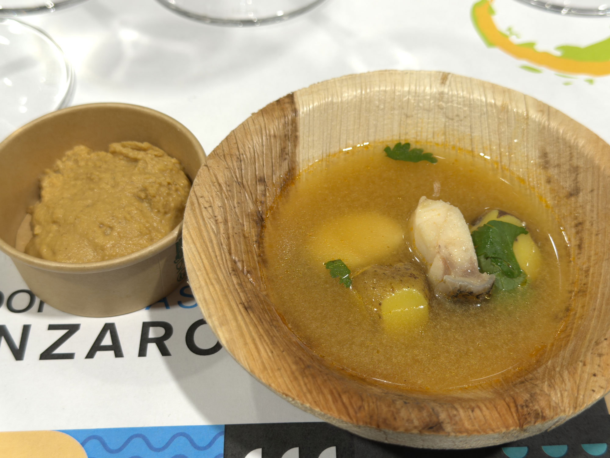 Aprovechamos la cuchara para un Caldo de mero y escaldón de gofio, como reflejo de la isla de La Graciosa. El jable también se hizo presente con una Batata, medregal curado en sal de Janubio y mojo agripicante. La fiesta de la tradición continuó con las Garbanzas, pulpo y pota, que nos regresaron al hogar de cada uno, antes del fin de fiesta salado protagonizado por dos pases: Caldo de millo y Baifo frito y papita negra.