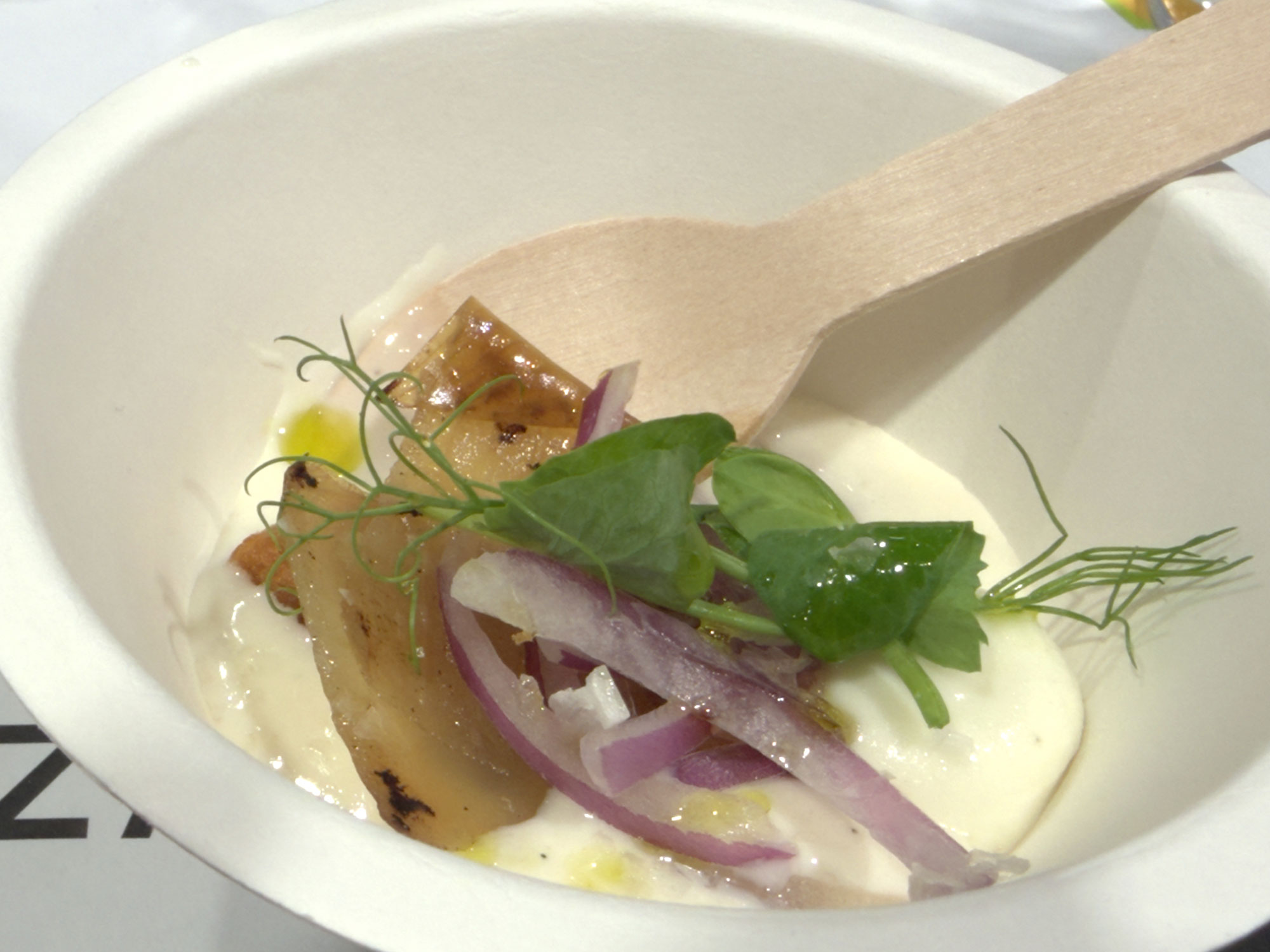 La mesa la abrió un surtido de quesos, de tierno a curado, de varias queserías insulares, acompañados de mermeladas y miel de la isla. Le siguió una acertada composición de papas de Los Valles, con su mojo rojo, y morena frita en forma de chips. La cuchara se hizo presente, por primera vez, en un equilibrado platillo de Cebolla de Soo asada, suero de cabra, pan pasa madre y mojo de cilantro, que puso en alerta a los que no conocían las posibilidades de la cocina conejera.